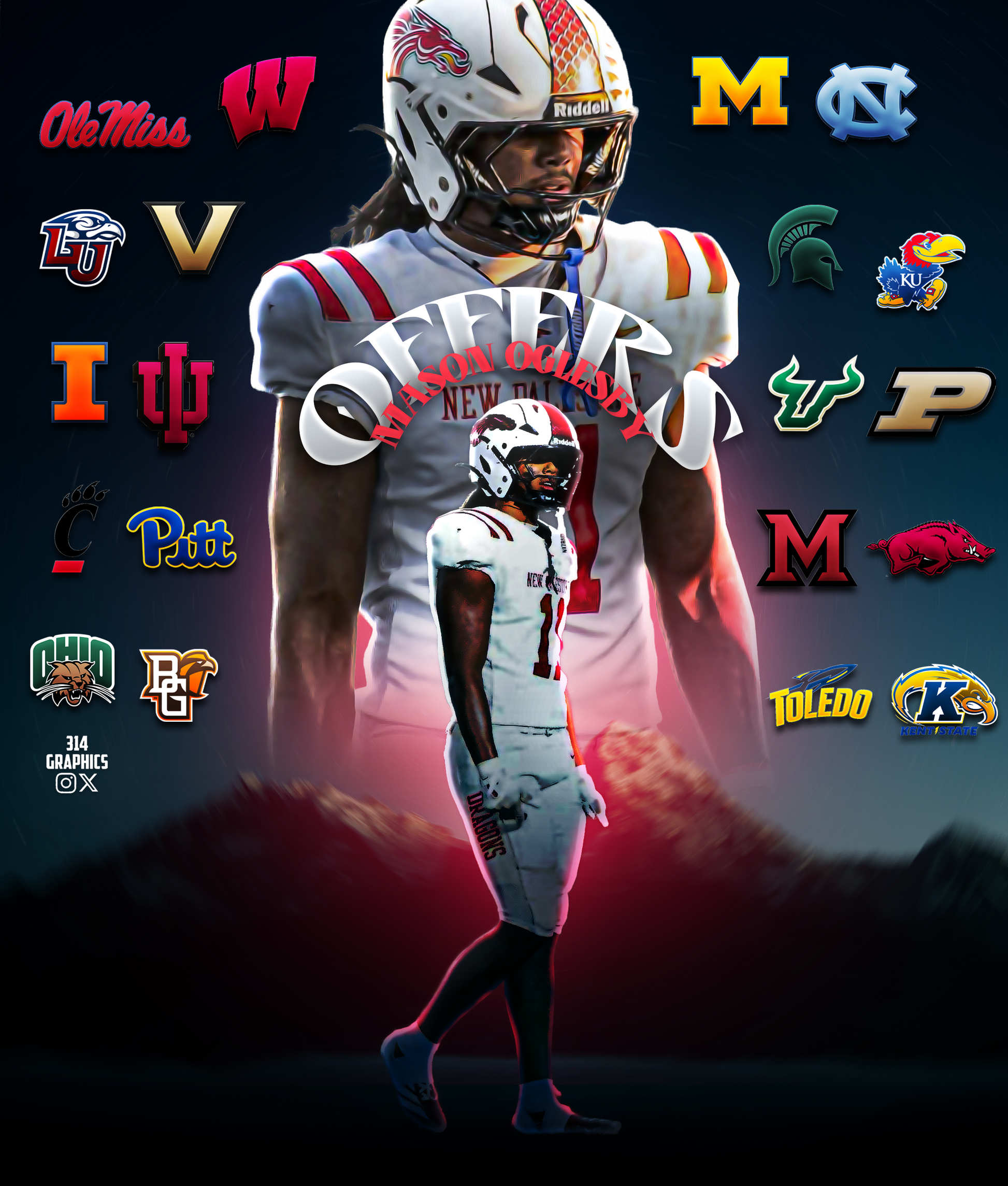 Editable Photoshop file featuring Mason Oglesby’s offer design. Clean layers, customizable logos, colors, and text—perfect for sports edits and recruiting posts.